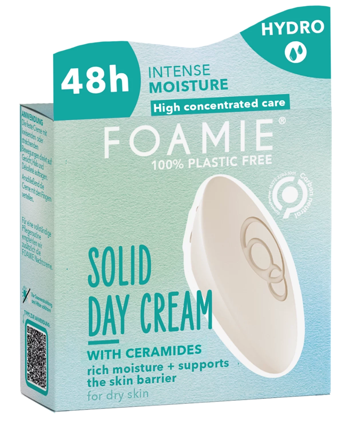Tuhý hydratační krém nabízí dlouhotrvající účinek, osvěžuje a posiluje kožní bariéru, díky čemu zůstává pokožka hydratována až do 48 hodin. Lehce se vstřebává a zabezpečuje pružnost a svěžest pleti. Tuhé pleťové krémy Foamie jsou účinnou alternativou ke krémům v plastovém balení. Kompaktní krémy v ergonomickém tvaru pro rychlé a pohodlné používání se po nanesení změní v krémovou strukturu a dokonale se vstřebou do pokožky. Díky svému praktickému úspornému balení jsou ideální i na cesty. Balení vydrží přibližně dva měsíce. Používají se stejně jako klasický pleťový krém – na očištěný obličej naneste krouživými pohyby krém přímo na pleť a rozetřete ho prsty, aby se zapracoval do pokožky. Případně pro snadnější péči vmasírujte navlhčenými konečky prstů.