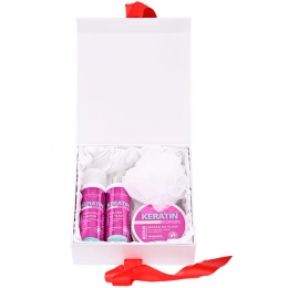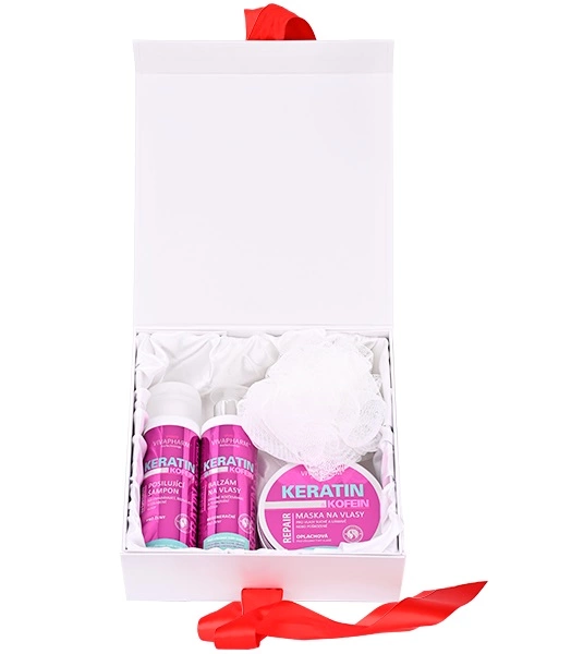 Luxuriöse Verpackung von Haarkosmetik mit Keratin und Koffein zur Pflege aller Haartypen, insbesondere für geschädigtes, geschwächtes und ausfallendes Haar, in einer Geschenkbox. Schenken Sie Schönheit und Jugend.
