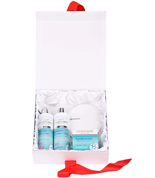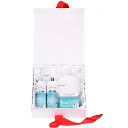 Geschenkverpackung mit feuchtigkeitsspendender Pflege mit Hyaluronsäure, die Verjüngung und Hydratation der Haut und des Teints gewährleistet. Es enthält niedermolekulare Hyaluronsäure, die aufgrund ihrer natürlichen Fähigkeit, den optimalen Feuchtigkeitsgehalt in der Haut zu bewahren, als Molekül der Jugend bezeichnet wird. Hyaluronsäure hilft, die Haut fest zu halten, bindet Wasser und hilft so, Falten und feine Linien zu glätten, beschleunigt die Geweberegeneration, regeneriert und strafft die Haut.