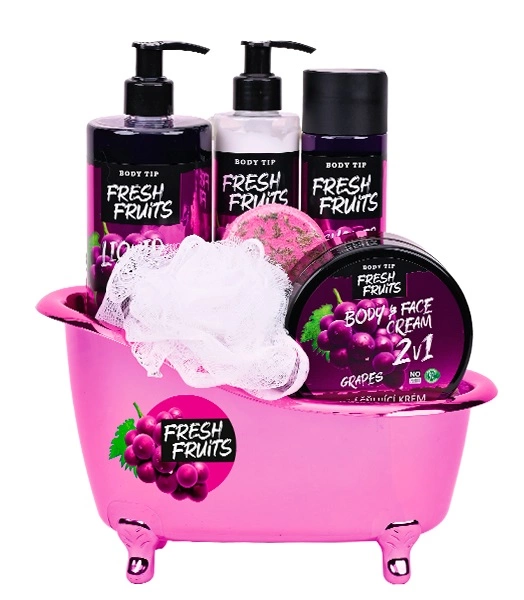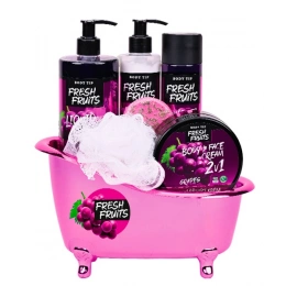Geschenkverpackung mit Kosmetik mit Traubenkernextrakten für die tägliche Haut- und Gesichtspflege in dekorativer Verpackung. Ein frischer, fruchtiger Duft belebt den Geist und verleiht den ganzen Tag über ein Gefühl von Frische.