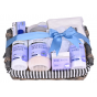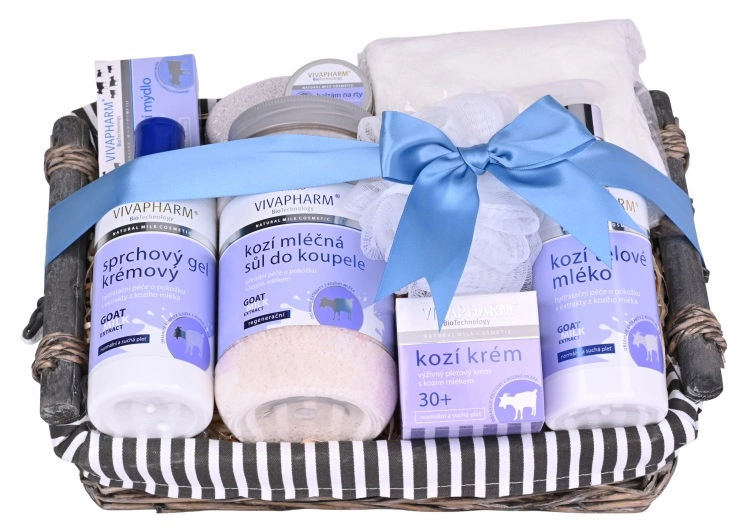 Schöne Geschenkverpackung mit Kosmetik aus Ziegenmilch zur Pflege von Körper- und Gesichtshaut in einem Weiden-Geschenkkorb.