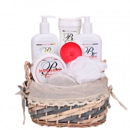 Geschenkverpackung mit Kosmetik mit Mandelöl zur Pflege von Körper- und Gesichtshaut in einem dekorativen Weidenkorb.