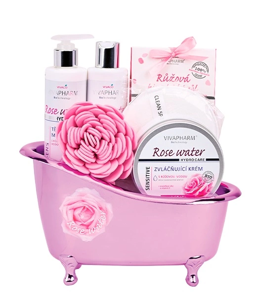 Geschenkverpackung mit Feuchtigkeitspflege mit Rosenwasser in dekorativer Verpackung.