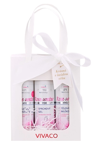 Geschenkverpackung mit Feuchtigkeitspflege mit Rosenwasser in einer Papierverpackung.