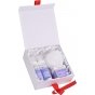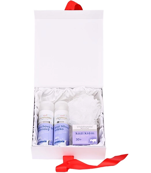 Geschenkverpackung mit Kosmetik aus Ziegenmilch zur Pflege von Körper- und Gesichtshaut in dekorativer Papierbox.