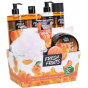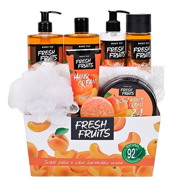 Geschenkverpackung mit Kosmetik mit Aprikosenöl zur Pflege von Körper- und Gesichtshaut in dekorativer Papierverpackung. Der angenehme Duft von Aprikosen wird Sie den ganzen Tag begleiten.