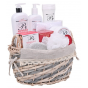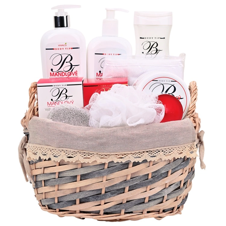 Geschenkverpackung mit Kosmetik mit Mandelöl zur Pflege von Körper- und Gesichtshaut in einem dekorativen Weidenkorb.
