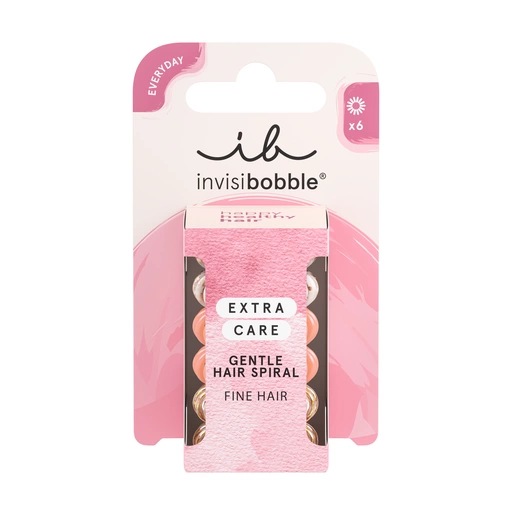 Die spiralförmige Haargummi Invisibobble Extra Care ist ideal für feines Haar und bietet dank der HAIRLOVETECH™-Technologie hervorragenden Tragekomfort, da sie das Haar sanft greift. Die Verpackung enthält 6 Stück Haargummis.