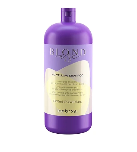 Shampoo gegen Gelbstich Inebrya Blondesse No-Yellow Shampoo, angereichert mit Seidenproteinen und Traubenkernextrakten, tönt aufgehellte Strähnen, Highlights und blondiertes Haar, um Gelbstiche zu reduzieren. Auch geeignet für die Anwendung auf grauem Haar, um einen weißlichen Effekt zu erzielen.