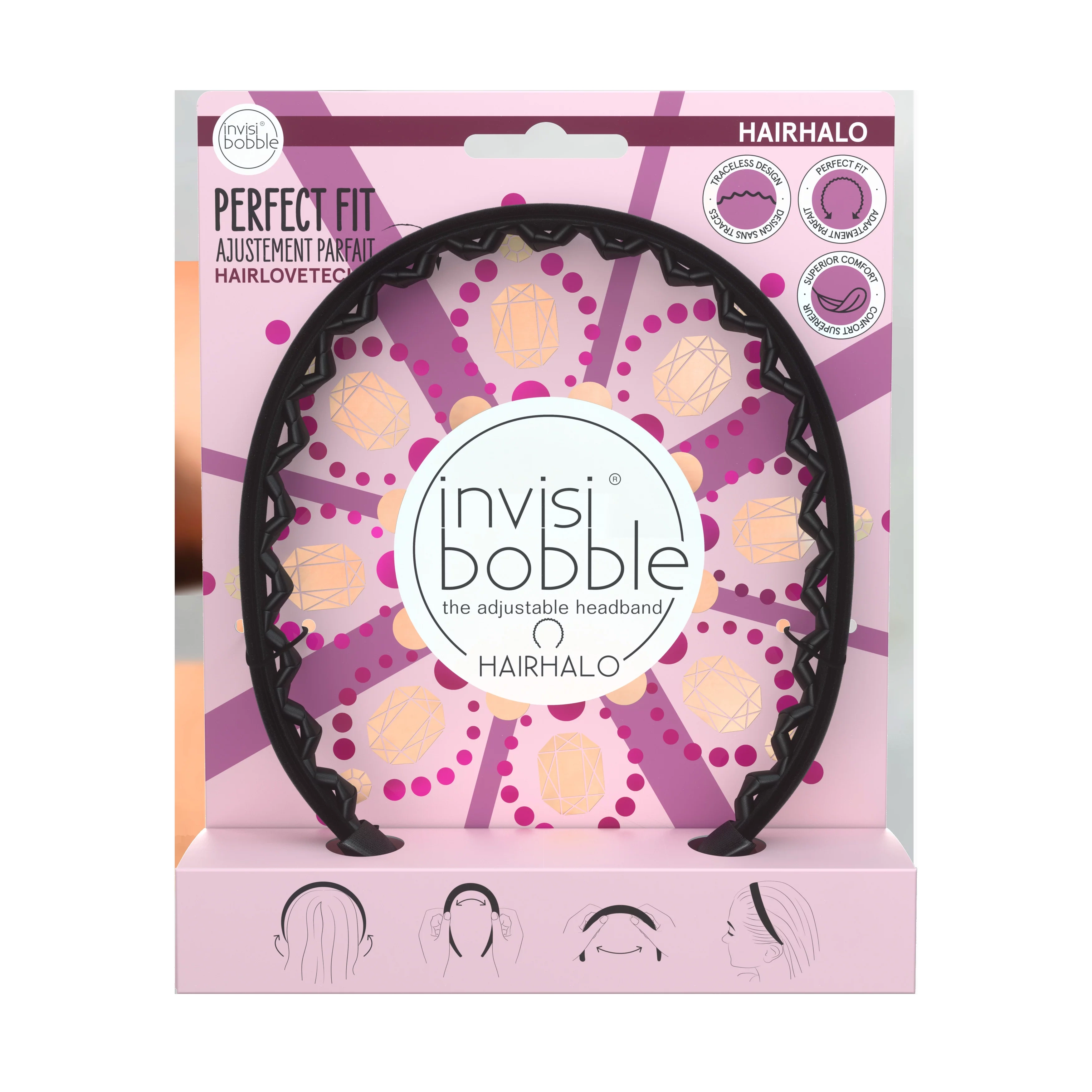 Invisibobble HAIRHALO Inspiriert von seinen Fans aus der ganzen Welt, feiert invisibobble® deren Vielfalt und Sinn für Stil. Das verstellbare Haarband invisibobble® HAIRHALO erhält somit ein Design in limitierter Auflage. HAIRHALO Crown and Glory mit feinem schwarzen Samtmaterial passt zu jedem Outfit und ist das perfekte Accessoire für die Feiertage.