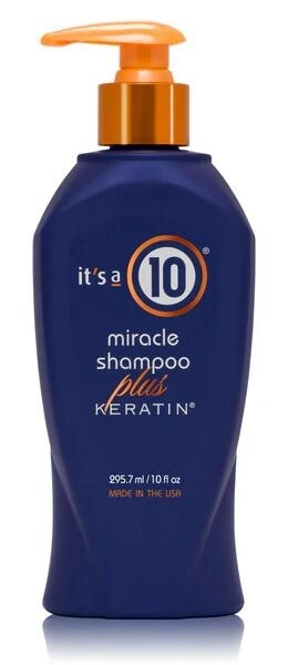 It’s a 10 Miracle Shampoo Plus Keratin Reinheit, Pflege und Schutz in einem Schritt Shampoo mit Keratin für den täglichen Gebrauch, das das Haar reinigt, stärkt und vor Hitze und äußeren Einflüssen schützt. Hinterlässt das Haar weich, glänzend und gesund aussehend – und duftet zudem wunderbar. Hauptbestandteile: – Panthenol • Grüner Tee • Sonnenblumenextrakt • Leinöl • Linalool Anwendung: Auf das nasse Haar auftragen und sanft einmassieren. gründlich abspülen.