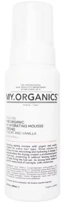 Styling-Schaum mit starker Fixierung MY.ORGANICS The Organic My Hydrating Mousse Strong Joghurt und Vanille auf Joghurt- und Vanillebasis, ideal für alle Haartypen. Verleiht dem Haar Volumen und strahlenden Glanz, während es tiefenwirksam hydratisiert und nährt. Bei Anwendung vor dem Föhnen der Haare bildet es eine Schutzbarriere auf der Haaroberfläche und schützt sie so vor der Wirkung heißer Luft, ohne Rückstände zu hinterlassen, und hilft, die Frisur zu fixieren. Dank ihrer mittleren Fixierkraft ist sie für alle Haartypen geeignet, einschließlich Frisuren mit Lockenwicklern.
