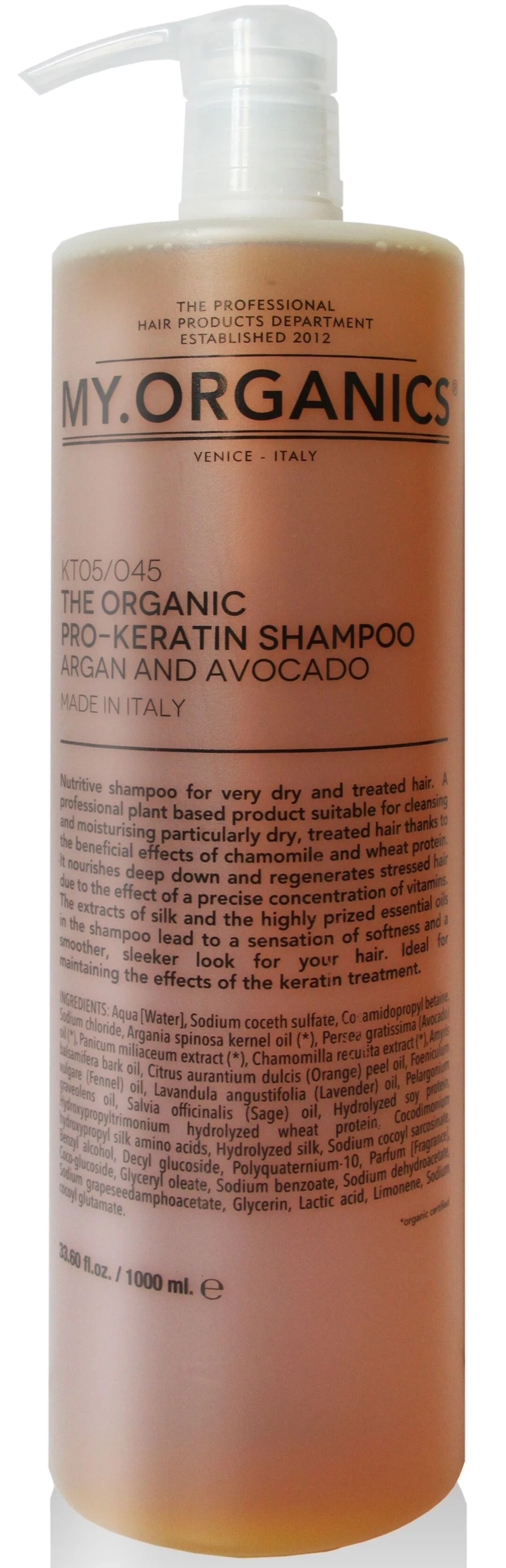 ORGANICS Keratin verleiht dank der rekonstruktiven Eigenschaften von Keratin geschädigtem Haar, das chemischen Produkten ausgesetzt war, Gesundheit und strahlenden Glanz. Bei Verwendung der kompletten Serie erreichen wir eine tiefenwirksame Reinigung der Kopfhaut und unterstützen und beschleunigen so die Regeneration.Nährendes Shampoo MY.ORGANICS The Organic Pro-Keratin Shampoo Argan And Avocado für sehr trockenes und chemisch geschädigtes Haar. Produkt für den professionellen Gebrauch, pflanzlich basiert, geeignet für die Reinigung und Hydratation von extrem trockenem und chemisch geschädigtem Haar dank der wohltuenden Wirkung von Kamille und Weizenproteinen. Dank der ausgewogenen Konzentration von Vitaminen sorgt es für eine tiefenwirksame Ernährung und Regeneration von gestresstem Haar. Seidenextrakte und wertvolle ätherische Öle, die im Shampoo enthalten sind, verleihen Ihrem Haar ein Gefühl von Geschmeidigkeit und ein glatteres, samtigeres Aussehen. Das ideale Produkt zur Verlängerung der Wirkung einer Keratin-Kur.