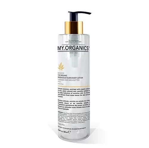 Luxuriöse natürliche Körpermilch MY.ORGANICS The Organic Prodigious Flora Body Lotion ist geeignet für die tägliche Feuchtigkeitspflege empfindlicher Haut.Eine sanfte Emulsion, angereichert mit organischen Extrakten aus Hanfsamen (Cannabis Sativa), Sheabutter, Aloe, süßen Mandeln und Kamelie, hinterlässt die Haut weich und hydratisiert.
