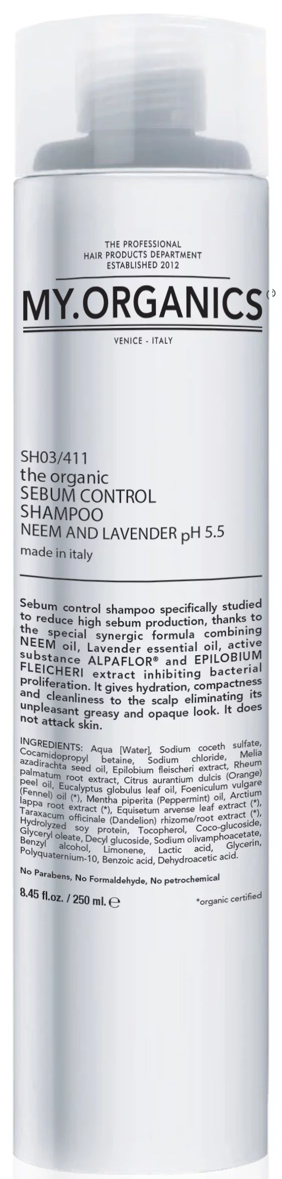 Shampoo ME.ORGANICS The Organic Sebum Control Shampoo Neem And Lavender, speziell entwickelt zur Reduzierung der erhöhten Talgproduktion, dank der wirksamen Kombination von Inhaltsstoffen wie Neemöl, Lavendelöl, dem Wirkstoff ALPAFLOR® und dem Extrakt aus EPILOBIUM FISCHERI, der die Verbreitung von Bakterien verhindert. Spendet der Kopfhaut Feuchtigkeit, Integrität und Reinheit und beseitigt das unangenehme fettige und matte Aussehen. Reizt die Haut nicht.