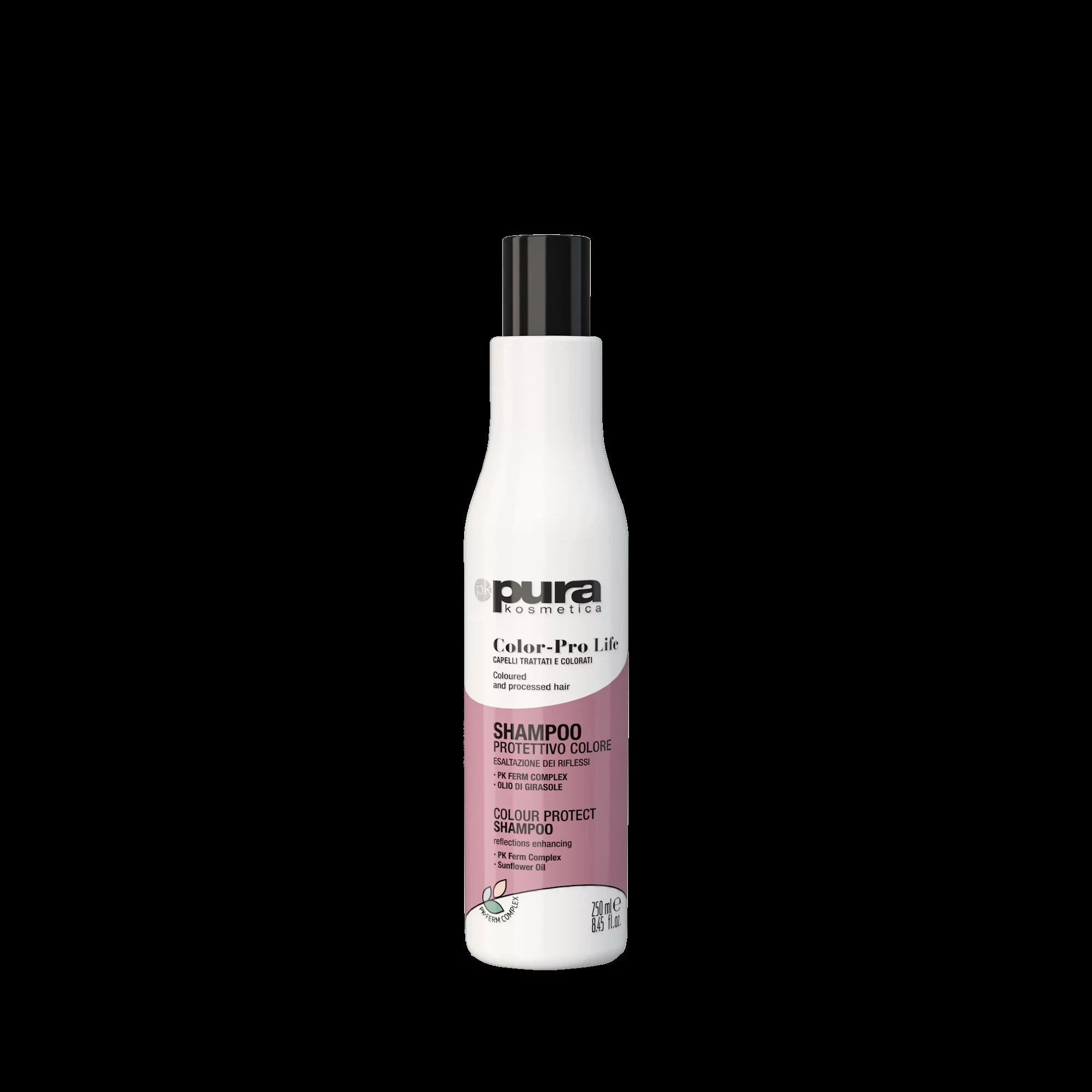 PURA KOSMETICA COLOR PRO LIFE – Shampoo für coloriertes Haar pH 5,00 – 6,00. Der Wirkstoff ist BIO SONNENBLUMENÖL, das hilft, die Intensität und Sättigung der Farbe zu erhalten. Für gefärbtes, blondiertes und chemisch behandeltes Haar bestimmt.