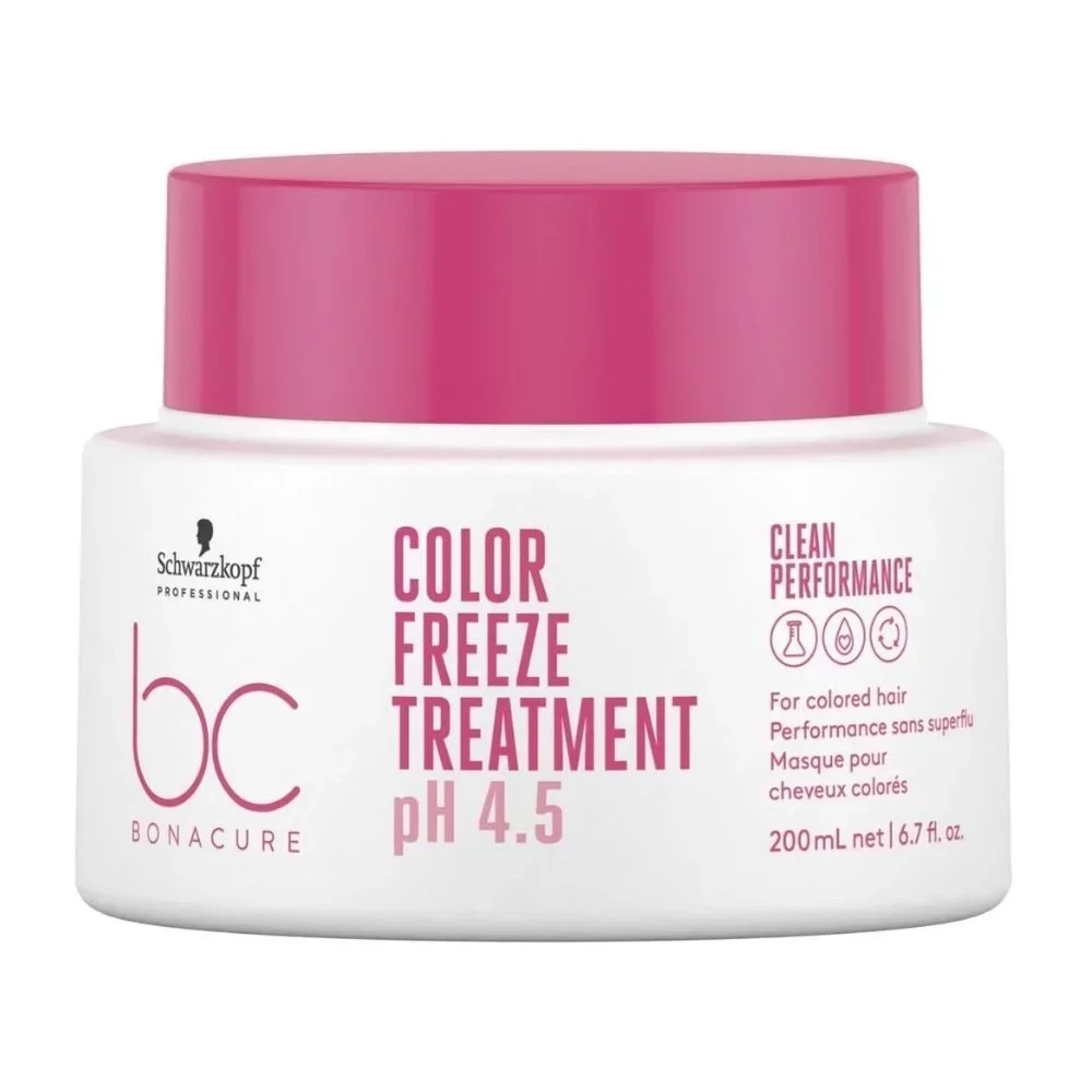 Schwarzkopf BC Bonacure Color Freeze Treatment ist eine cremige Maske für coloriertes Haar. Intensiv regeneriert und erneuert das Haar. Die vegane Zusammensetzung stellt den Haaren den optimalen pH-Wert von 4,5 wieder her und schützt die Haarfarbe vor dem Verblassen. Ohne Silikone und künstliche Farbstoffe.