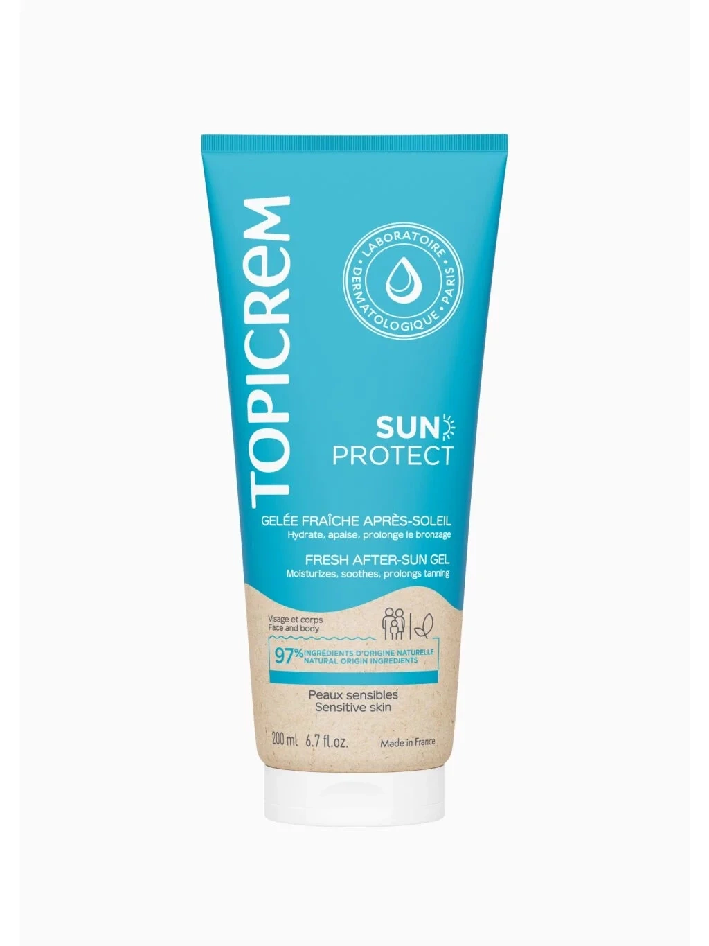 Topicrem After Sun Fresh Gel ist ein erfrischendes After-Sun-Gel, das die durch Sonneneinstrahlung beanspruchte Haut intensiv hydratisiert, beruhigt und regeneriert. Dank der leichten Geltextur zieht es schnell ein, bietet einen sofortigen Kühleffekt und hinterlässt keinen fettigen oder klebrigen Film. Es enthält feuchtigkeitsspendende und beruhigende Inhaltsstoffe, die helfen, das Gleichgewicht der Haut wiederherzustellen und die Bräune zu verlängern. Geeignet für empfindliche Haut der ganzen Familie.