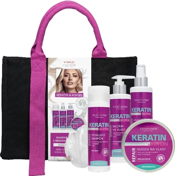 Große Damenhandtasche mit Haarkosmetik mit Keratin und Koffein zur Pflege aller Haartypen, insbesondere für geschädigtes, geschwächtes und ausfallendes Haar.