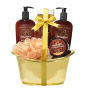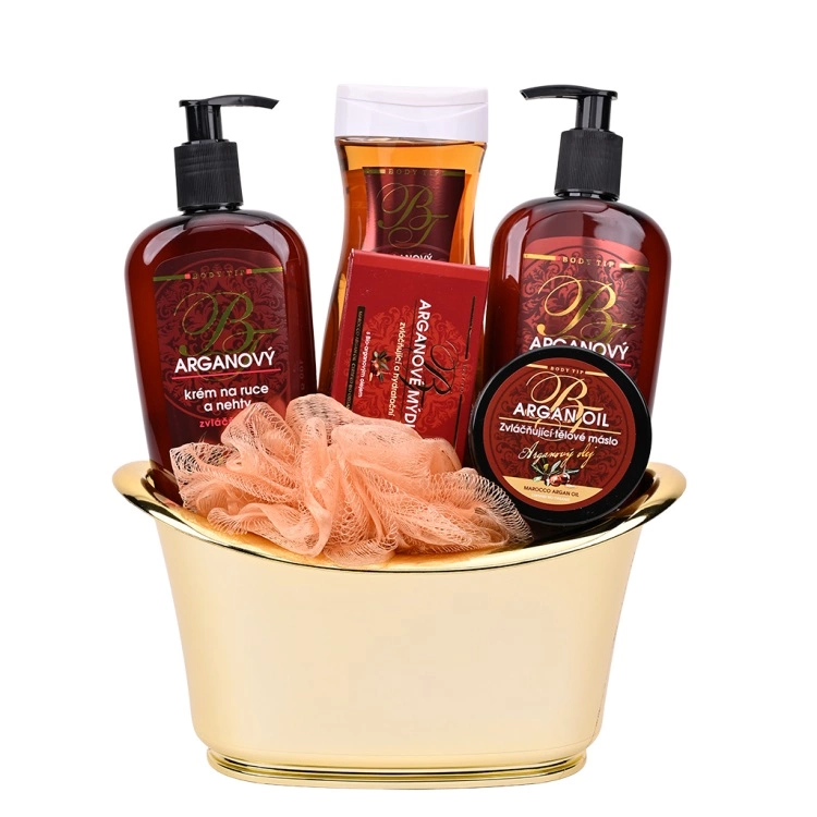 Schöne Geschenkverpackung mit Kosmetik mit Bio-Arganöl zur Pflege der Haut von Körper und Gesicht in einer dekorativen Wanne.
