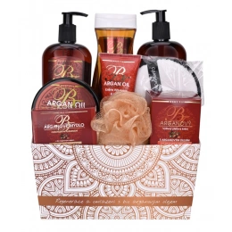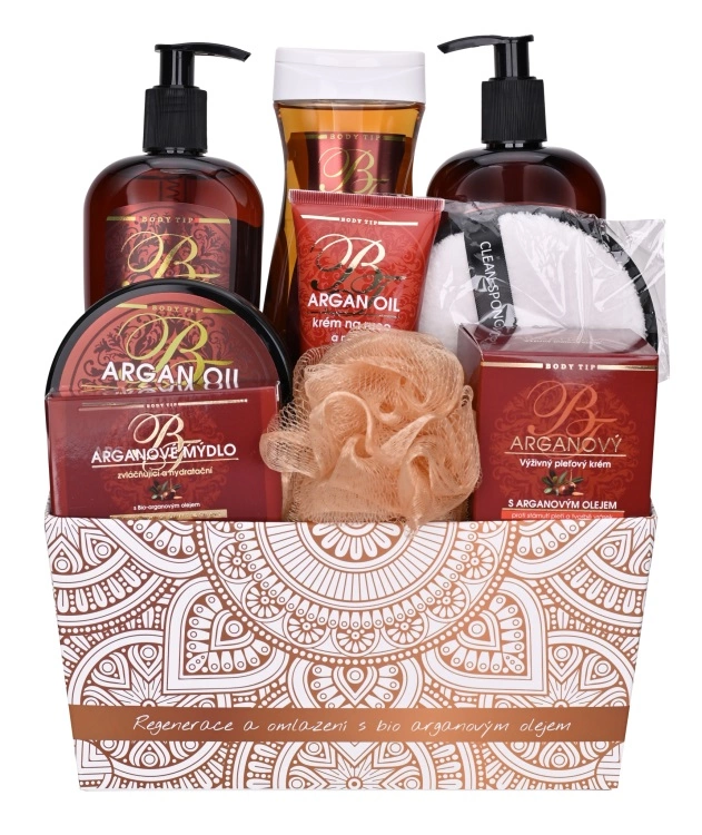 Schöne Geschenkverpackung mit Kosmetik mit Bio-Arganöl zur Pflege der Haut von Körper und Gesicht in einer stilvollen Papierbox.