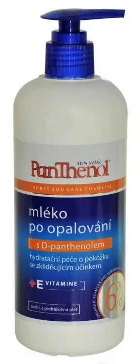 Beruhigende Körperlotion mit hohem Gehalt an D-Panthenol und Vitamin E für schnelle Hydratation und effektive Regeneration gereizter und geröteter Haut nach dem Sonnenbad oder Baden. Schützt die Haut vor vorzeitiger Alterung durch Sonneneinstrahlung. Es macht trockene Haut weich und geschmeidig, beugt Schuppenbildung vor und verlängert den Bräunungseffekt. Hinterlässt kein fettiges Gefühl und duftet angenehm.