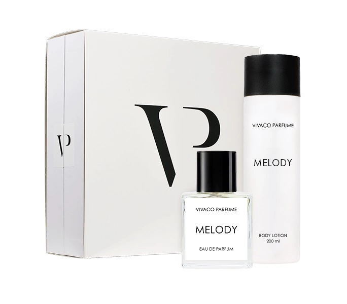 Entdecken Sie den Zauber der Eleganz in der Einfachheit mit der Geschenkverpackung des Parfums Melody.