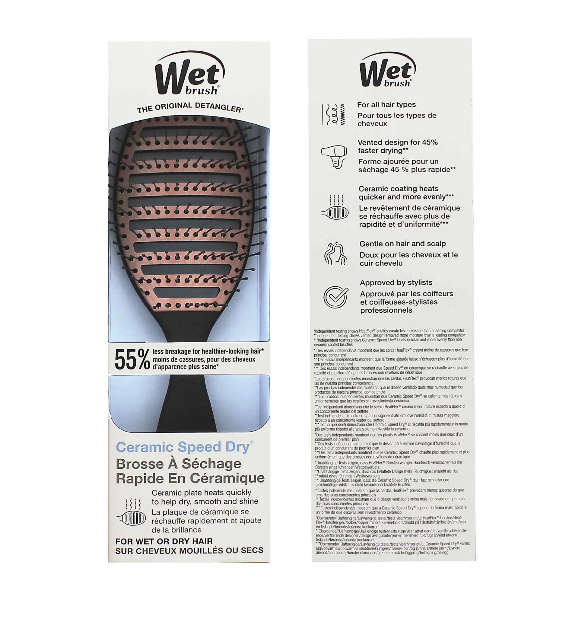 Aktualisieren Sie Ihre Styling-Routine und schützen Sie Ihr Haar vor Schäden mit der Wet Brush® Ceramic Speed Dry® Bürste. Sein belüftetes Design ermöglicht den Luftstrom durch die Bürste, wodurch die Trocknungszeit verkürzt und die Hitzeeinwirkung auf das Haar reduziert wird. Die neue Keramikoberfläche heizt sich schneller auf und hilft, das Haar um 45 % schneller zu trocknen. Die HeatFlex®-Borsten biegen sich beim Stylen, verhindern Ziehen oder Verfangen von Strähnen und schützen so das Haar vor Bruch und Beschädigung. Bis zu 55 % weniger Haarbruch für gesünderes Haar. Funktioniert hervorragend für alle Haartypen.